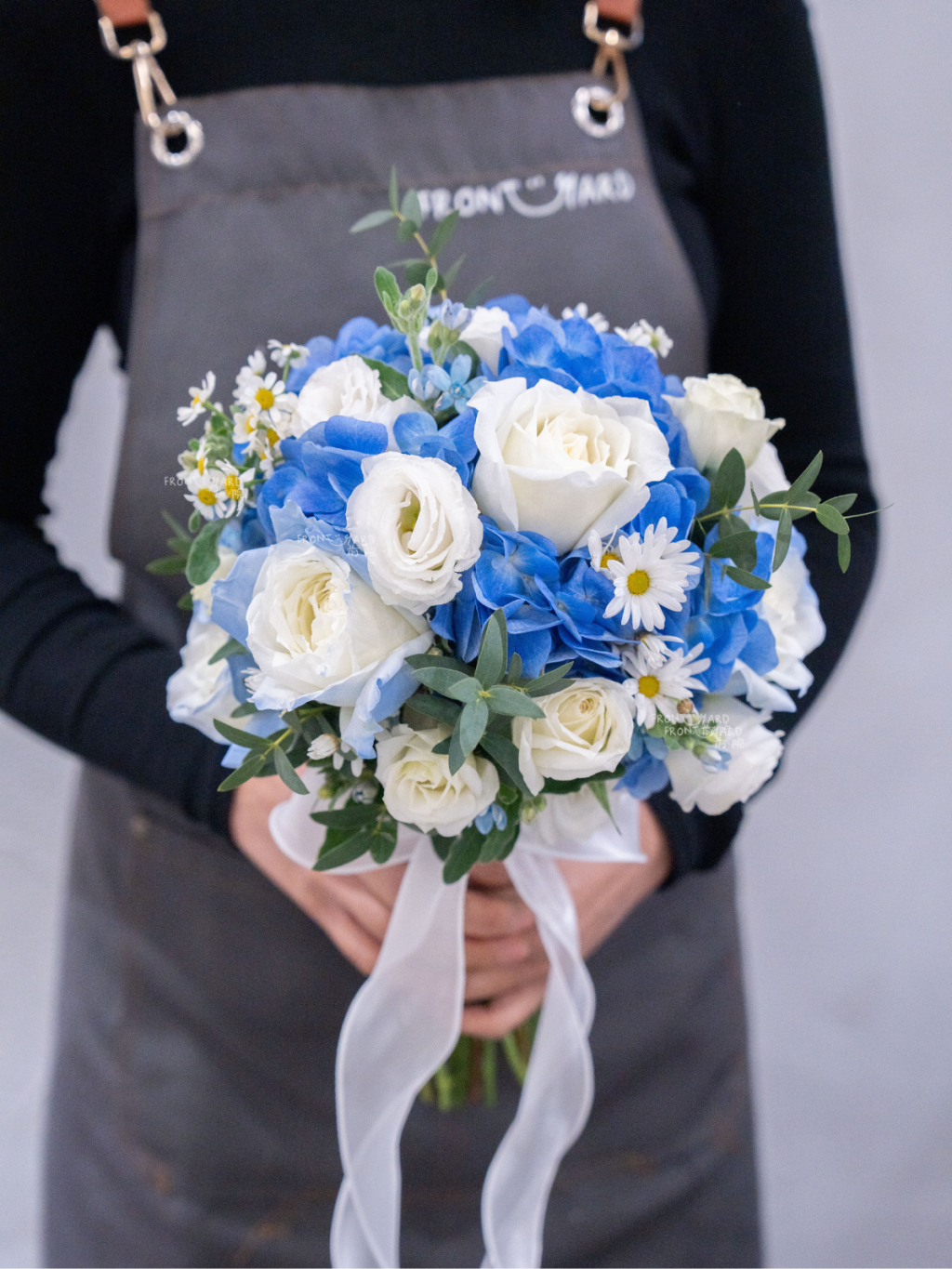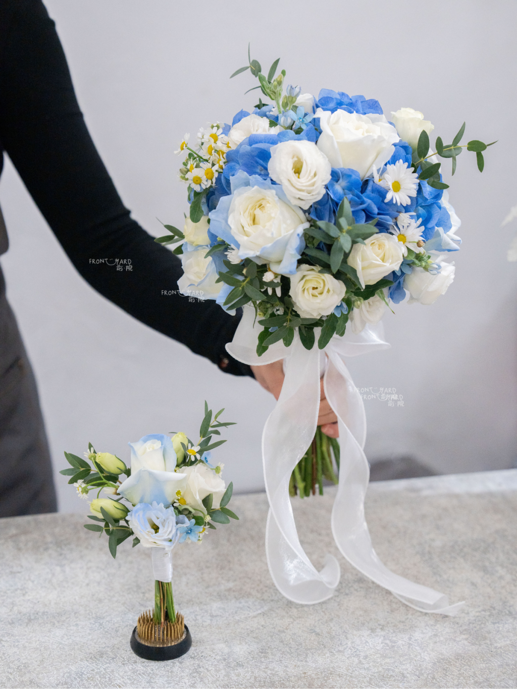 Celeste 這束藍白新娘捧花的靈感像月光落在海面上,清澈、寧靜,卻帶著細緻的層次。整體色調以透亮的白作為主光,搭配由淺至深的藍,形成柔和漸層,讓畫面乾淨而有深度。造型上我們以輕盈、雲朵感的輪廓為基礎,將重心控制得平衡,讓捧花在手上顯得俐落不笨重,同時在鏡頭裡保持飽滿與立體。