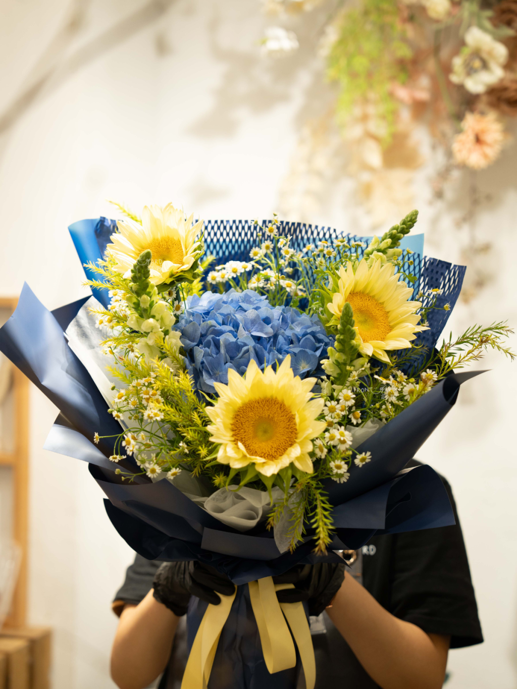 這種獨特的搭配在冷暖色調之間創造出和諧的平衡,使其既適合正式場合,也適合休閒慶典。花束中精心挑選的襯葉為整體設計增添了豐富的層次感和深度。大朵搶眼的向日葵與精緻的繡球花簇形成強烈的尺寸對比,創造出引人入勝的視覺動線,讓觀者的目光自然流轉於整個花束之間。