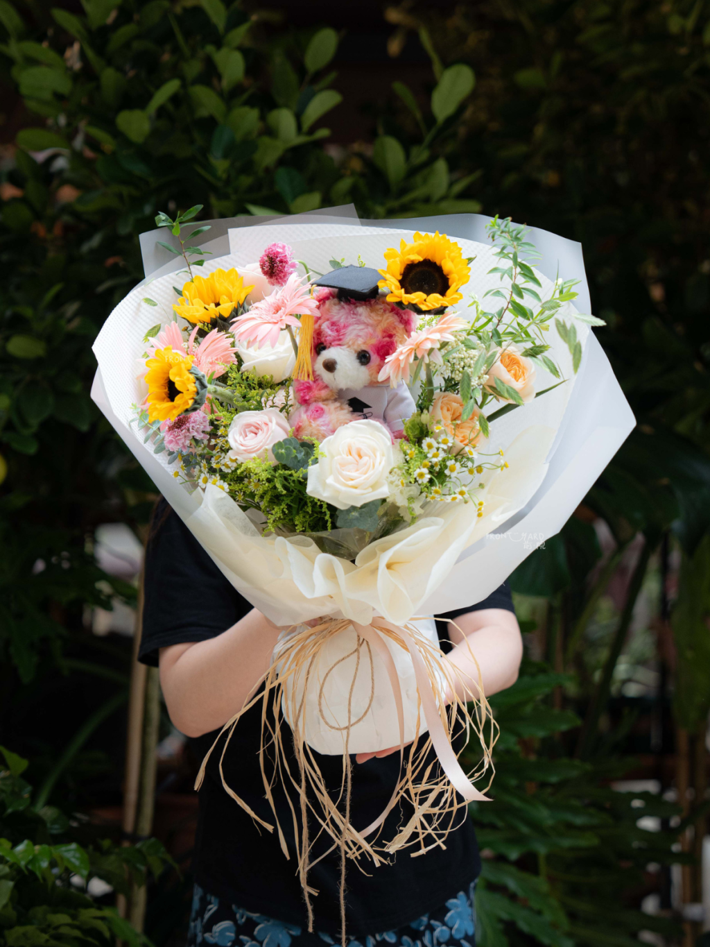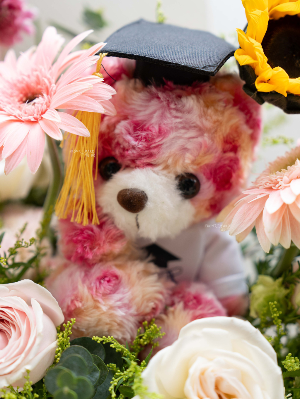 柔和的配色與粉色泰迪熊相得益彰,創造出協調悅目的視覺效果。這束花不僅紀念學術成就,更象徵著光明的未來,是畢業典禮的理想禮物。